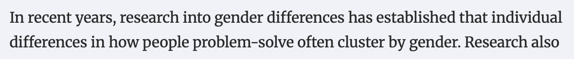 If I have to see this goddamn "spatial ability" argument one more time. Get more specific. What type of spatial ability you absolute clowns. Exactly what task, and explain how you address the spatial ability conflation with gender problems. Explain why and how these diffs vanish when you include all the spatial tasks THAT RESEARCHERS REMOVED BECAUSE GIRLS WERE GOOD AT THEM