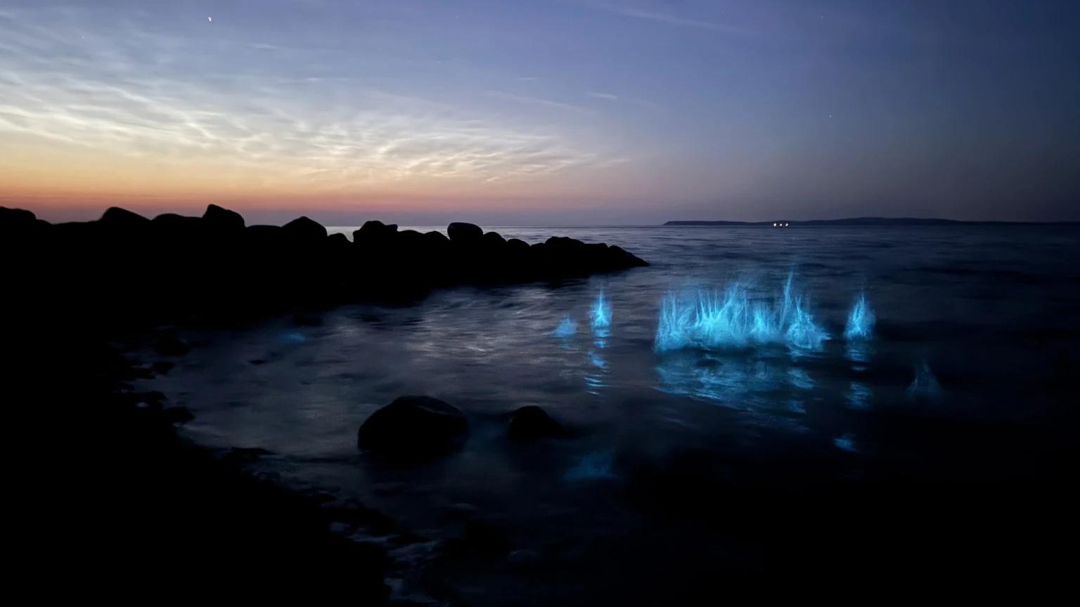 Dinoflagellates are marine plankton, so they are single-celled organisms and therefore extremely small. But when you have enough of them, they light up the sea, as the waves come crashing in on the shore.