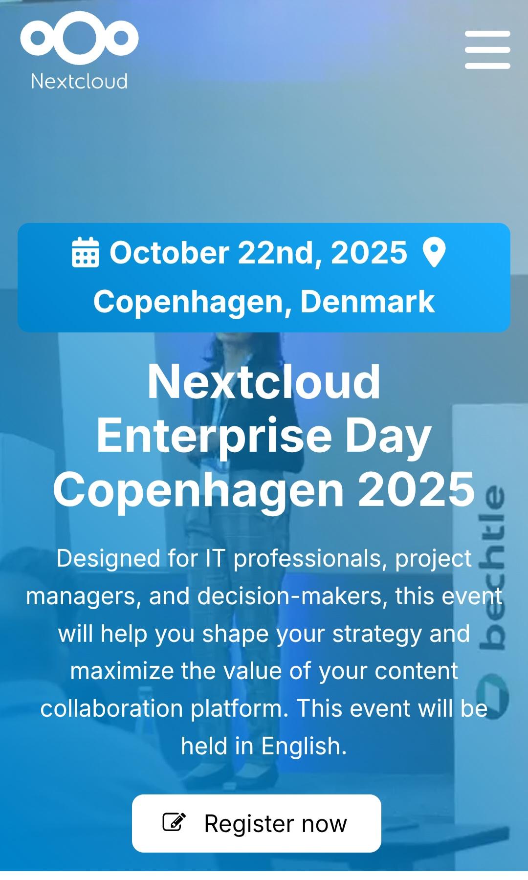 Weโre preparing our first Nextcloud Enterprise Day in Copenhagen, Denmark. It will take place in Q4 2025, with the exact date and venue to be confirmed soon.Nextcloud