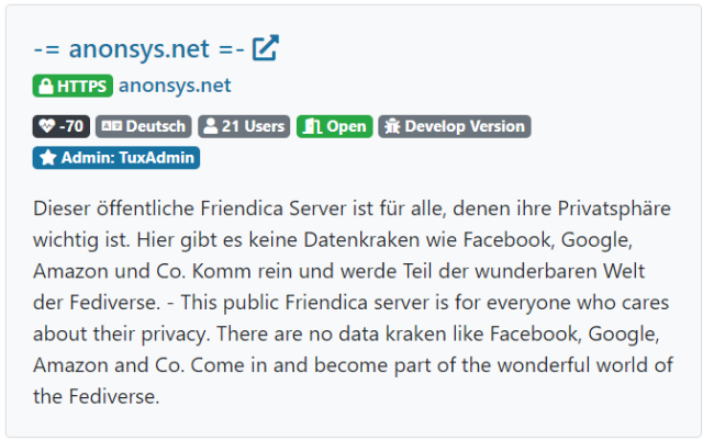 Guten Morgen @Friendica Support mir ist gerade aufgefallen, dass diese Friendica Instanz (anonsys.net) nicht mehr im Verzeichnis auftaucht: dir.friendica.social/servers/d…
