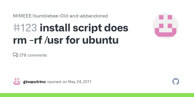 install script does rm -rf /usr for ubuntu ยท Issue #123 ยท MrMEEE/bumblebee-Old-and-abbandoned