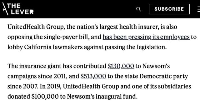 Gov. Gavin Newsom backed off his previous support of the idea -- after he & Dems received huge money from UnitedHealth donors. buff.ly/3ZPLOPu