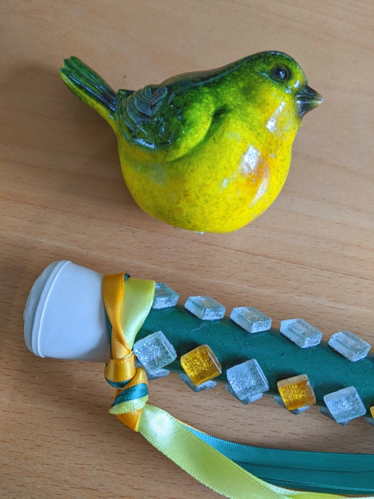 For seven years the ceramic bird glued to the top has held steady. Last year it came off. I asked people what to use in order to re-attach it. A particular glue was suggested as being extra tough. It was a two-step thingo. It lasted one day at the festival for which I needed it, but by late afternoon, someone pointed out that my bird was hanging by a gooey thread. So, I removed her before she could fall off and possibly break.