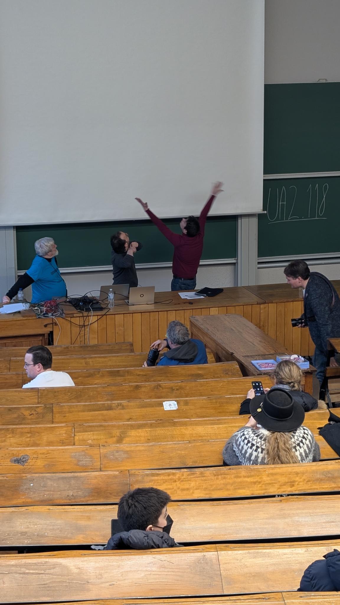 Live images of me gesturing reverently to the projector screen as if it was some kind of eldritch horror (this did indeed suffice to get it working ) #FOSDEM