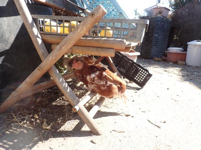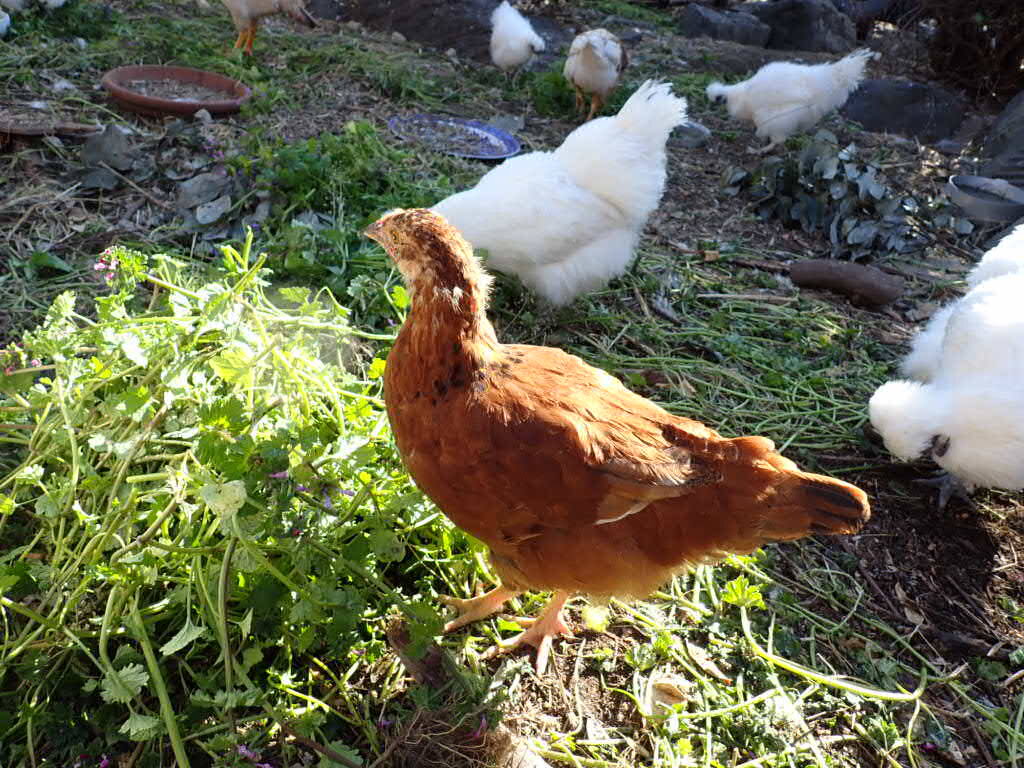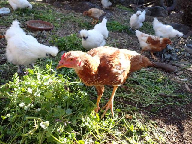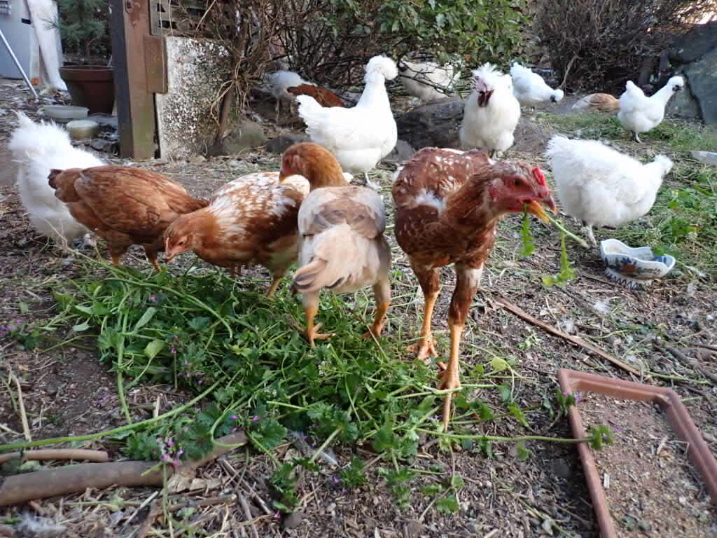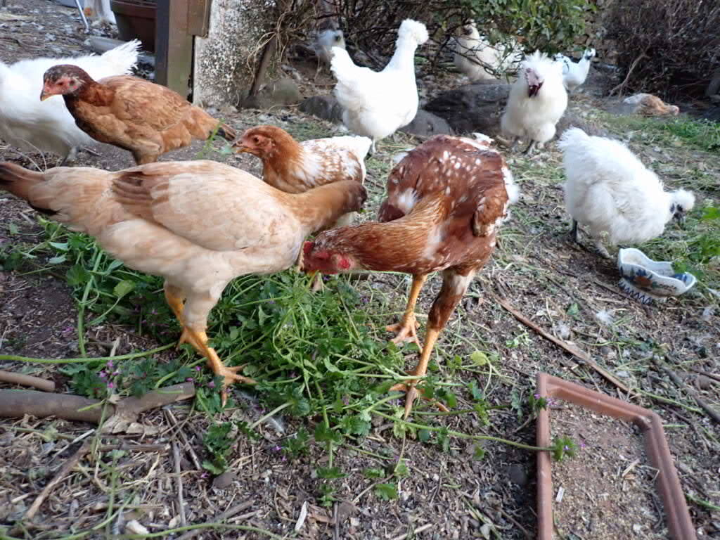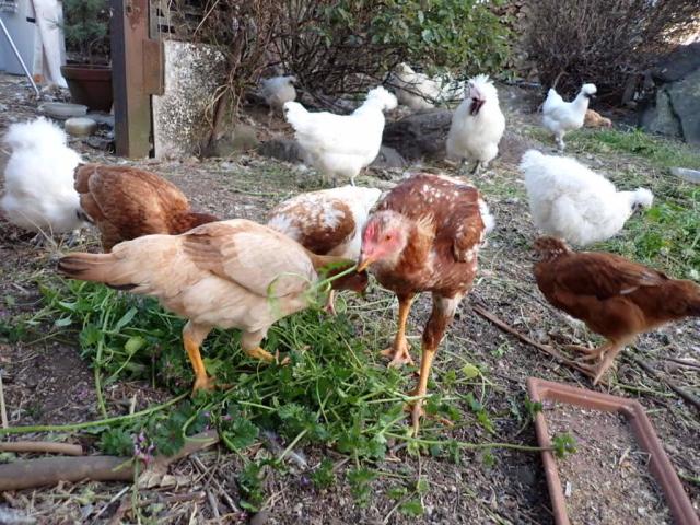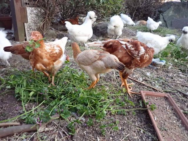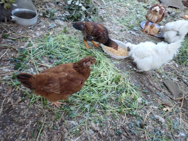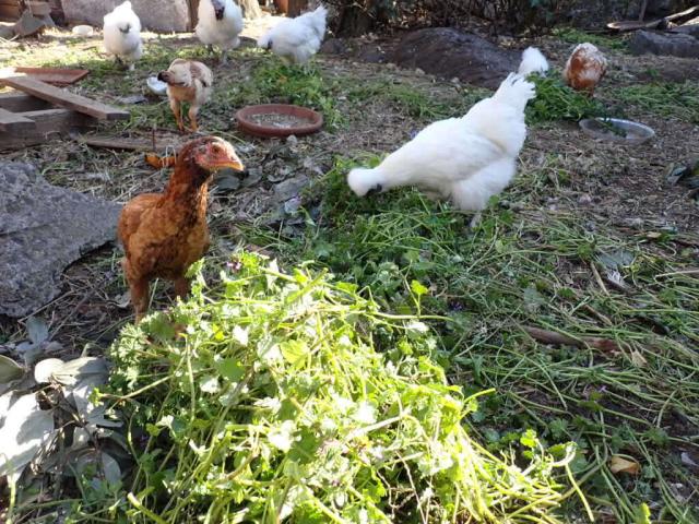 Feeding Common Henbit and citrus fruits (from neighbor plots) to the birds, supplementing the store bought feed...