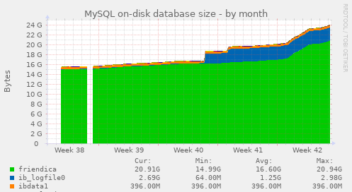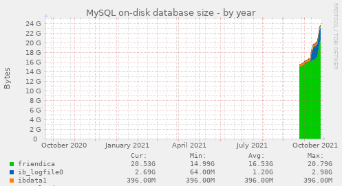 There haven't been any major changes to the usage of my system. Friendica configurations as shown below haven't been altered either (although I increased the mysql IB logfile setting). I updated to the 2021.09 release about about four weeks ago.