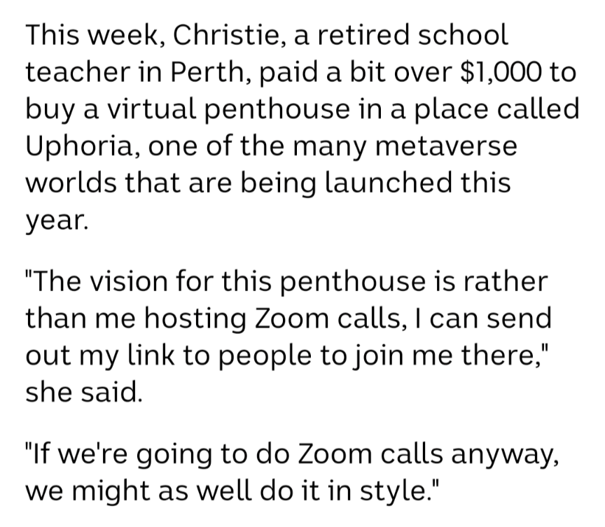 Get the fuck off my planet, you deranged fuckwits. Paying $1000 to have a few Zoom calls "in style"?