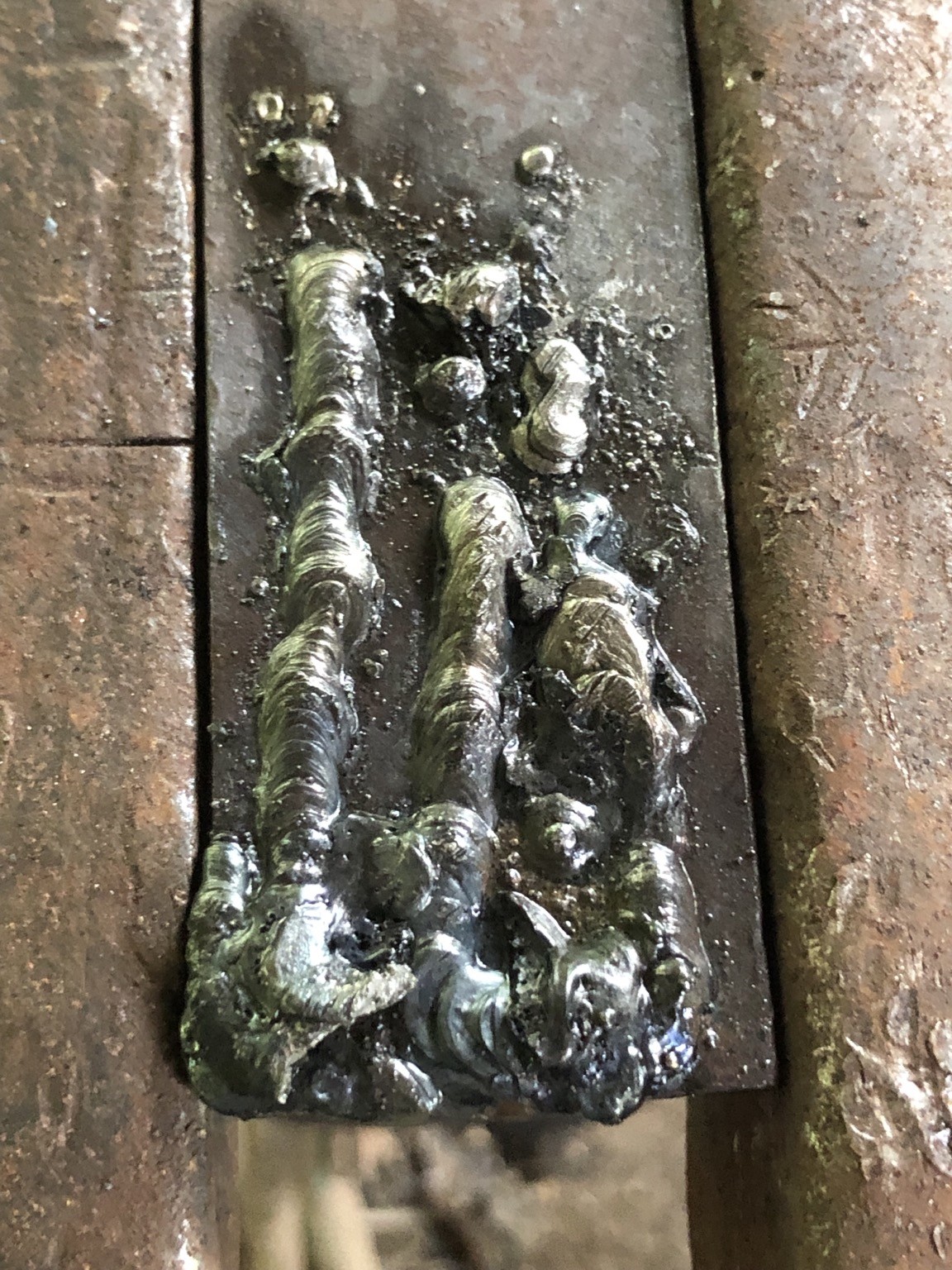 Well it definitely isn’t pretty but these are the first test beads from my very first attempt at arc welding. The one on the left was the first, which isn’t completely horrible but it got worse after that.