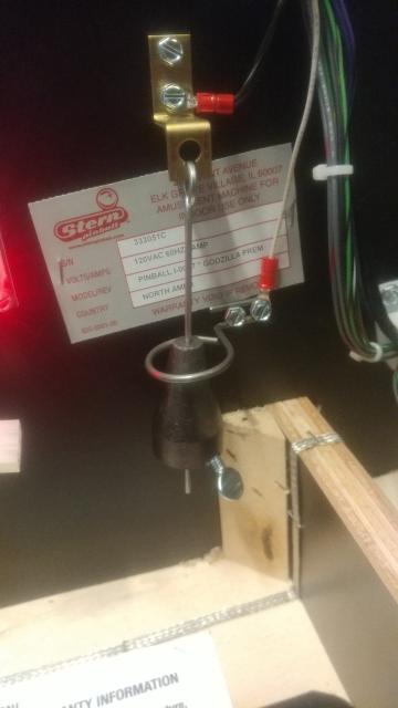 So hanging from a brass bracket is a steel rod with a cone-shaped weight attached. The weight is surrounded by a metal ring. The ring and the bracket form part of a circuit, so when the game is jostled too roughly the weight swings into the bracket, makes contact, and tells the player hey cool it.