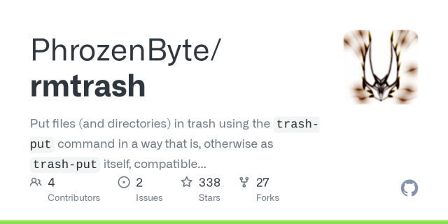 GitHub - PhrozenByte/rmtrash: Put files (and directories) in trash using the `trash-put` command in a way that is, otherwise as `trash-put` itself, compatible to GNUs `rm` and `rmdir`
