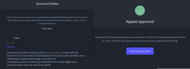 My appeal was approved, but will this be common? Because if so, everyone should know exactly which topics are in or out of bounds on Mastodon. I could not know a simple reply would trigger such a sanction.