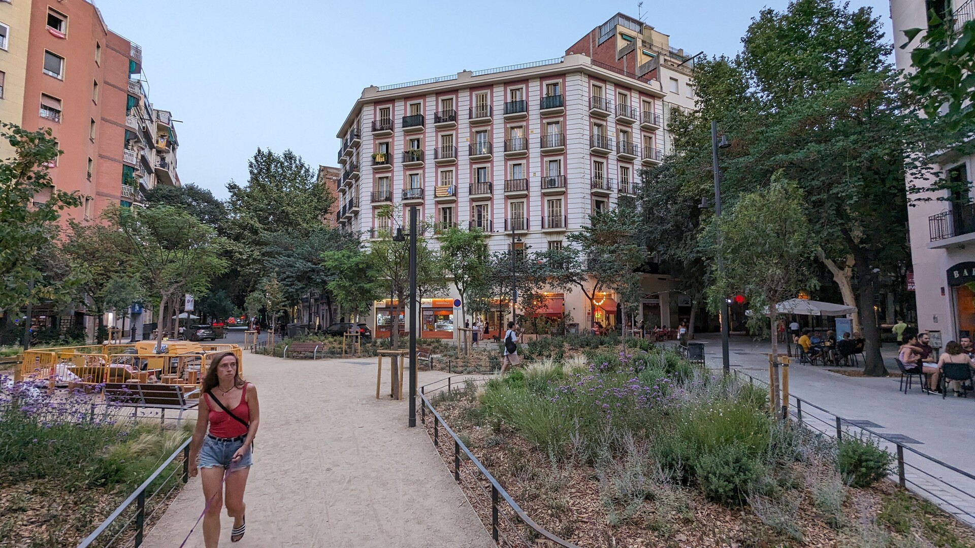 Went to see a superblock in Barcelona. Given how much they feature as urbanism of the future, they are amazingly simple. Take an intersection, block traffic in all four directions and you have a square. Plant trees, add some tables and benches. That's basically it. Replace cars with trees and don't privatize the resulting space. All you need, and all that is usually missing, is political will.