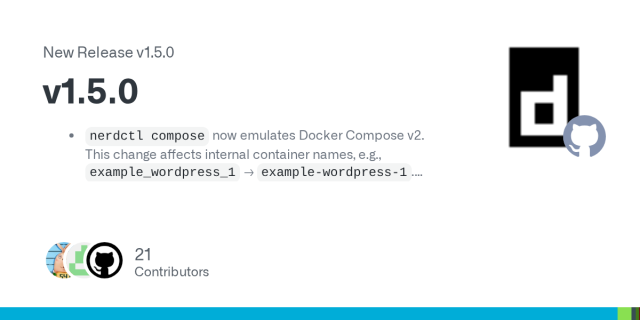 nerdctl compose now emulates Docker Compose v2. This change affects internal container names, e.g., example_wordpress_1 → example-wordpress-1. (#1644) Lazy-pulling now supports SOCI (#2347) Cha...GitHub