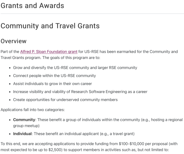 We are excited to announce a new program for @us_rse members! Part of the Alfred P. Sloan Foundation grant for US-RSE has been earmarked for the Community and Travel Grants program, to: