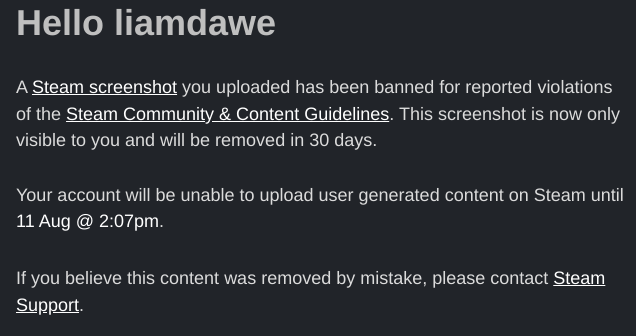 Valve's reply: "The content was removed by our staff based on an investigation of reports from other Steam users."