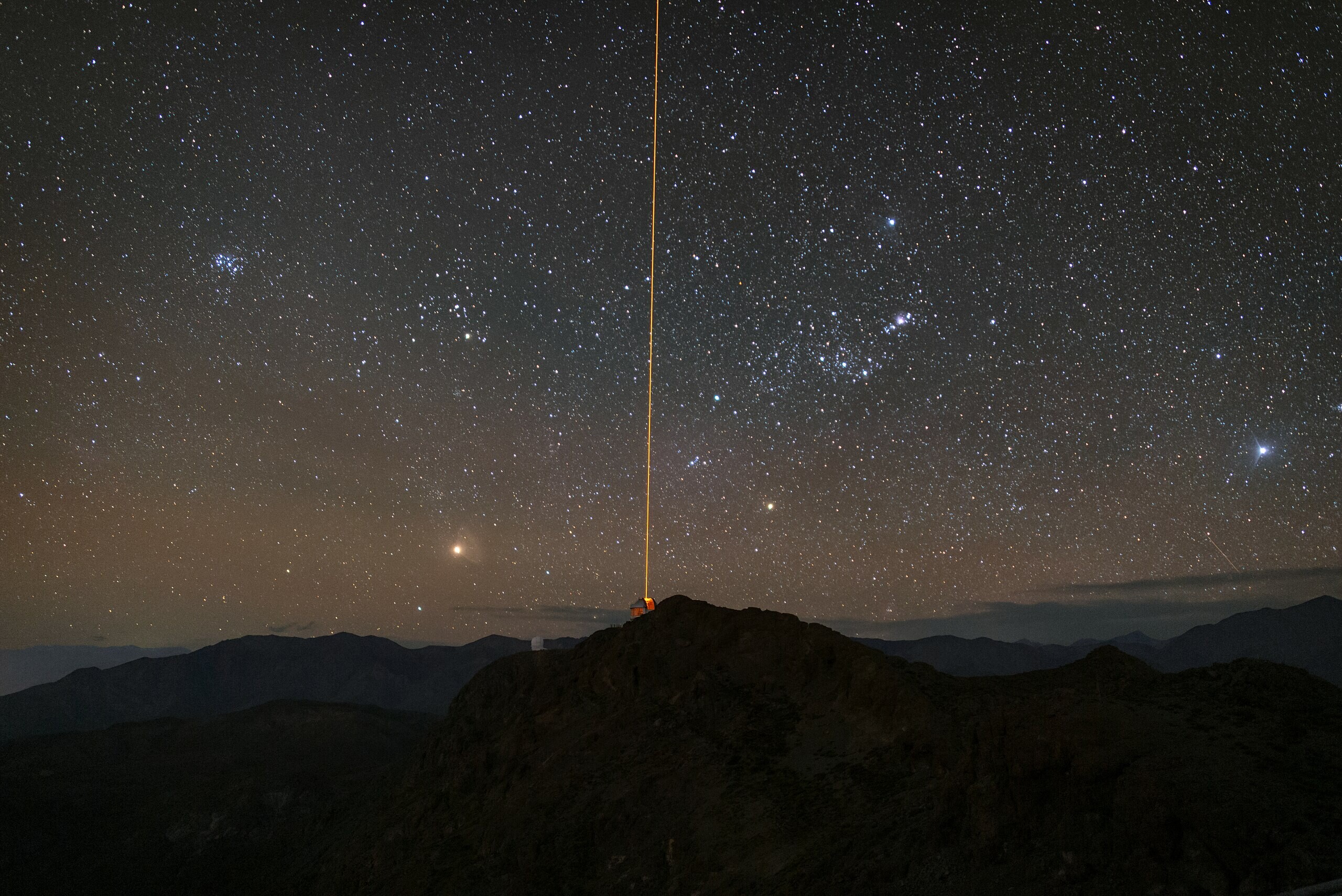 "The Gemini South telescope, one half of the International Gemini Observatory, operated by NSF's NOIRLab, with its laser guide star (LSG) beaming out into the star-speckled sky."