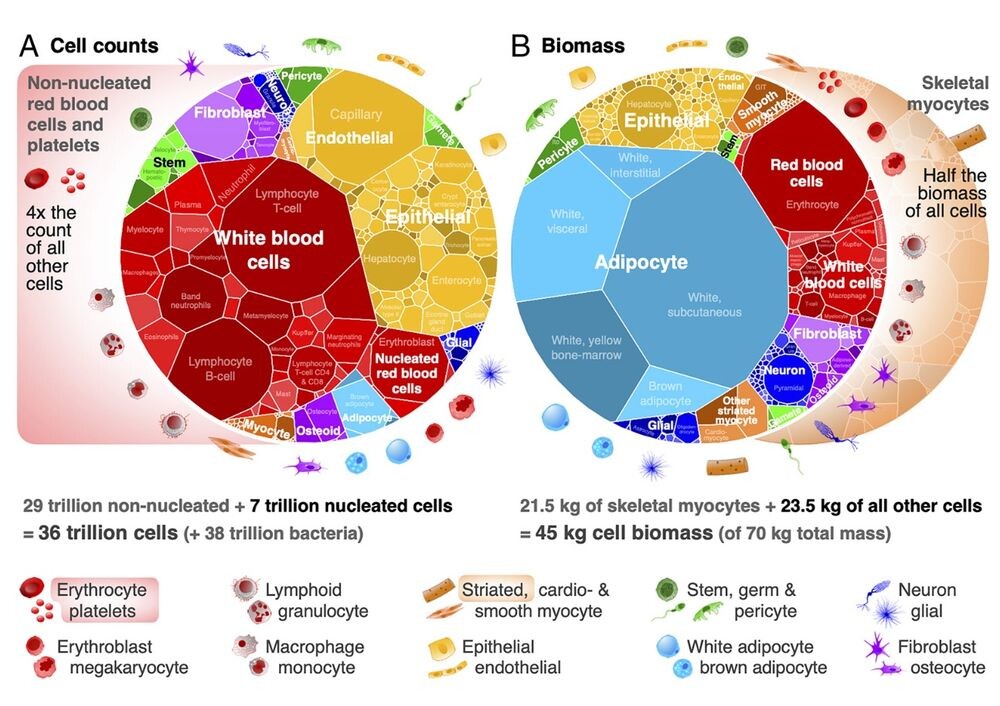 The latest on human total body cell count and cell size derived from >1,500 sources