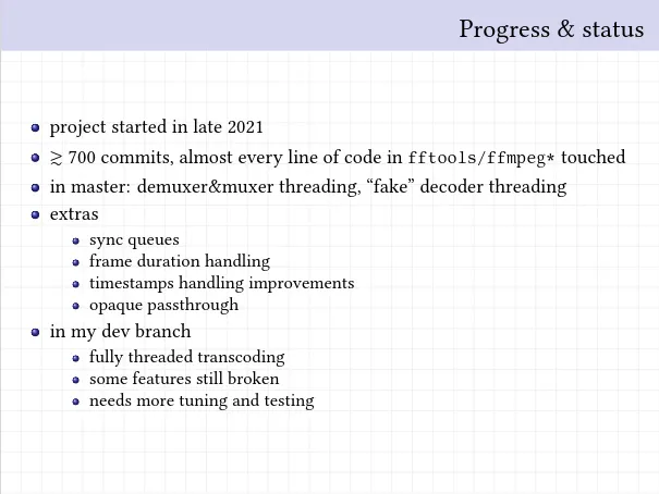 The long-in-development work for a fully-functional multi-threaded FFmpeg command line has been merged! The FFmpeg CLI with multi-threaded transcoding pipelines is now merged to FFmpeg Git ahead of FFmpeg 7.0 releasing early next yearwww.phoronix.com