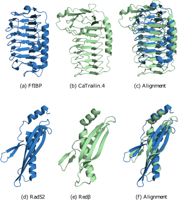 Very cool example of a few proteins that in BLAST-'space' don't look alike at all, but their AlphaFold structures align well suggesting they're distant homologues