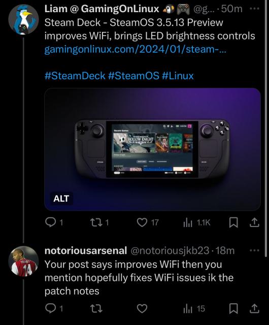 Steam Deck - SteamOS 3.5.13 Preview improves WiFi, brings LED brightness controls gamingonlinux.com/2024/01/stea…