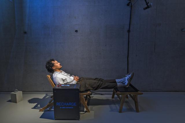 Recharge, 2023-2024. “Installation featuring a chair where you can relax and charge your phone. However, your phone will only charge when your eyes are closed.” driesdepoorter.be/recharge/