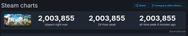 Palworld now the second ever game to hit 2 million concurrent players on Steam 🤯