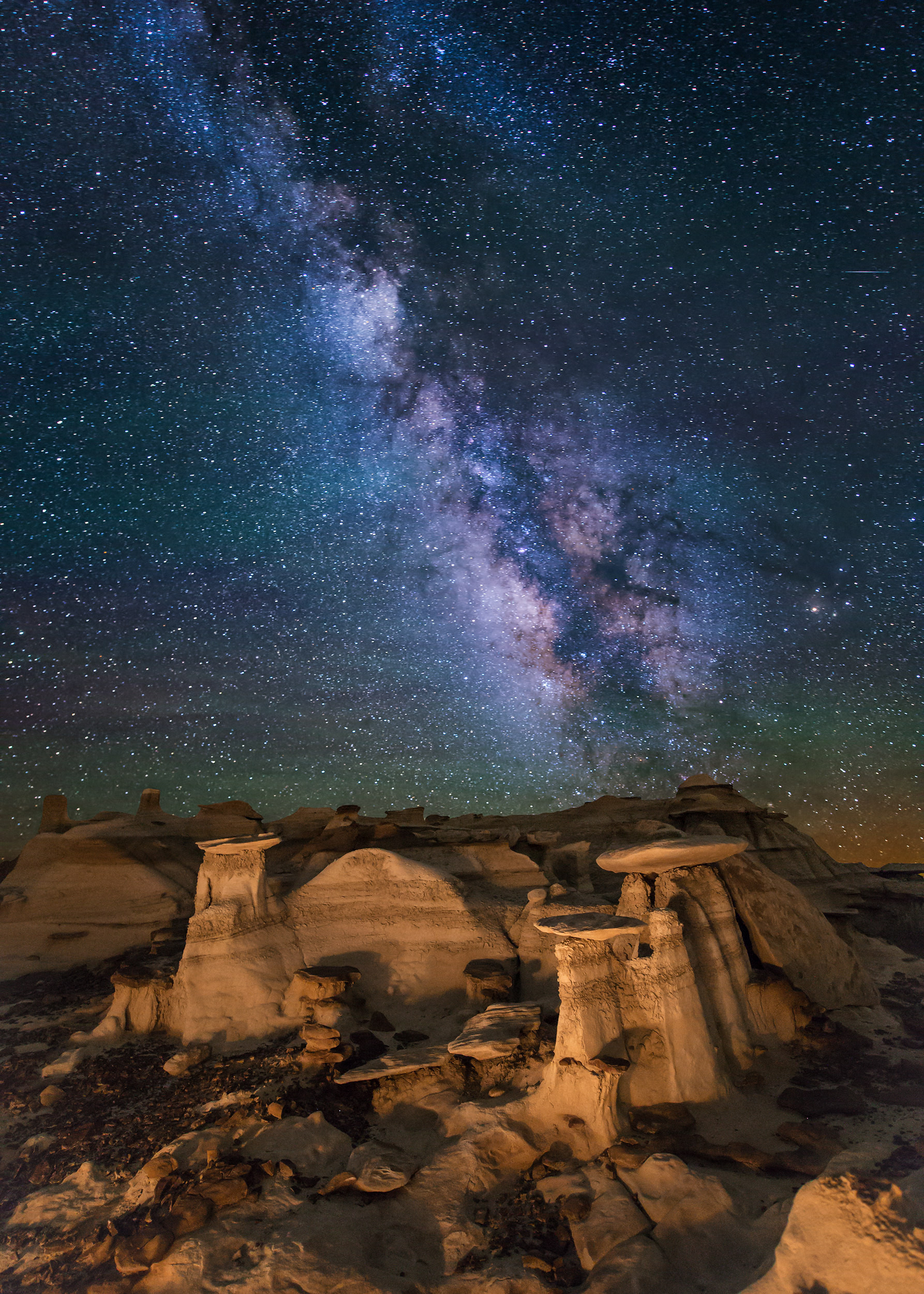 This photo was taken in the Bisti Badlands of New Mexico, USA. This is an area of severely eroded rock formations creating a wonderland of small to medium sized Hoodoos and a number of small arches.Flickr