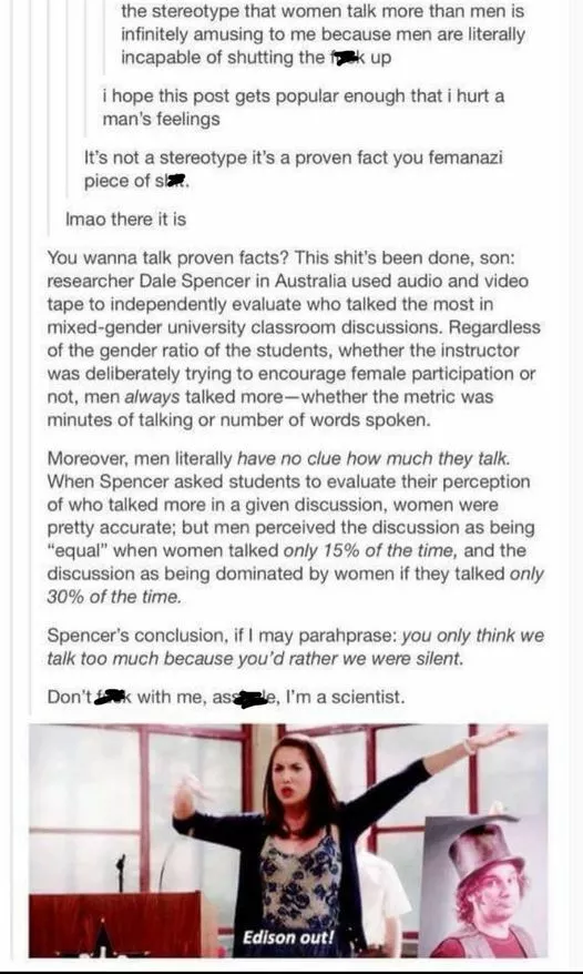 I've observed that ever since high school. That's when I first heard the "Women never shut up" thing and started paying attention. I immediately noticed that men talk all the time. Men also gossip at least as much as women.