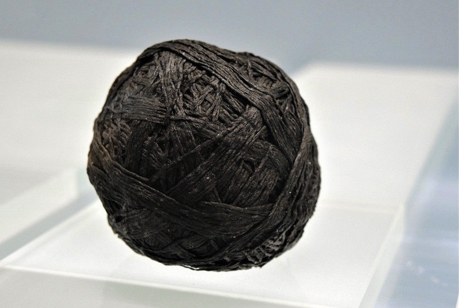 The condition of fabrics from pile dwelling and wetland settlements is amazing. This charred ball of thread was found at the site of Marin-Epagnier/Préfargier. It was made of hemp or lime fibres, and dates about 3900 to 3300 BC. The thread measures a total of about 10 m in length.