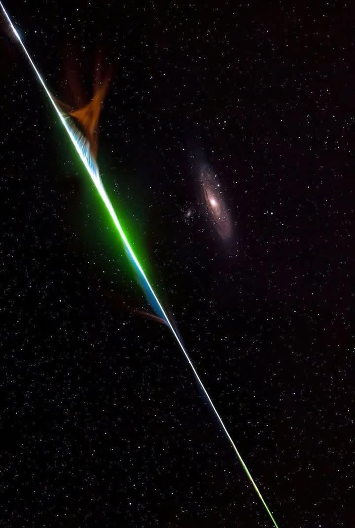 A bright meteor burned up in the atmosphere while capturing Andromeda Galaxy.