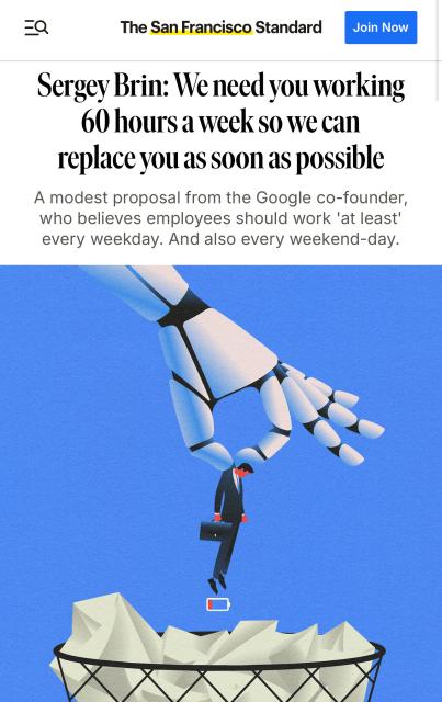 A modest proposal from the Google co-founder, who believes employees should work 'at least' every weekday. And also every weekend-day.Eli Grober (The San Francisco Standard)