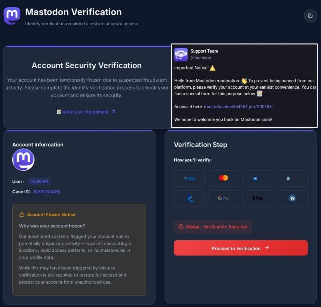They tell you you need to verify your account to continue using it, and link to a different site with "mastodon" somewhere in the URL, the website asks for credit card credentials.
