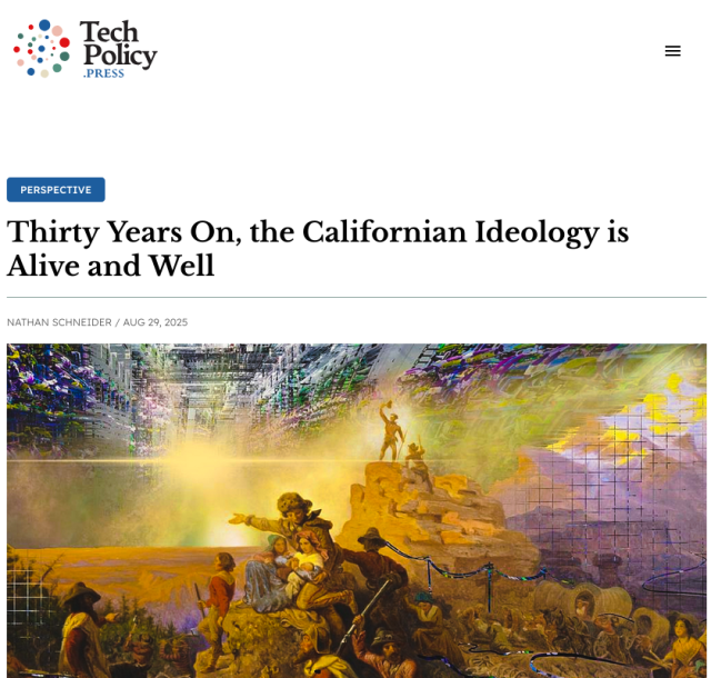 Thirty years ago, this week, an article diagnosing the "Californian Ideology" of Silicon Valley was published. This scathing critique has become a badge of honor for the new tech right.