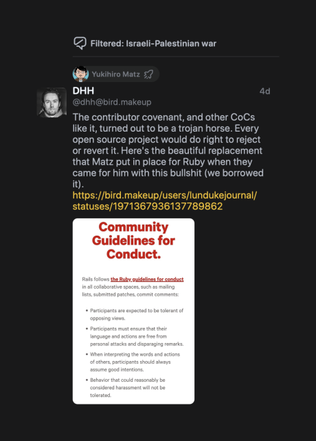 Attached: 1 image I need some help. It’s about… well, a lot, but it’s also about the Ruby community. A few days ago Drew DeVault created an issue on Omarchy requesting adding a Code of Conduct.PointlessOne Status