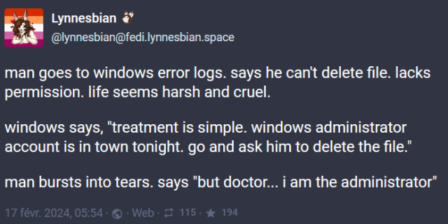 Lynnesbian @lynnesbian@fedi.lynnesbian.space man goes to windows error logs. says he can't delete file. lacks permission. life seems harsh and cruel. windows says, "treatment is simple. windows administrator account is in town tonight.Triplem (Know Your Meme)