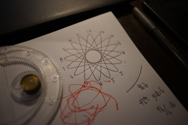 Every letter we send as Hundred Rabbits has a spirograph drawing at the back, I tend to mix and match cogs until I find a pattern I like.