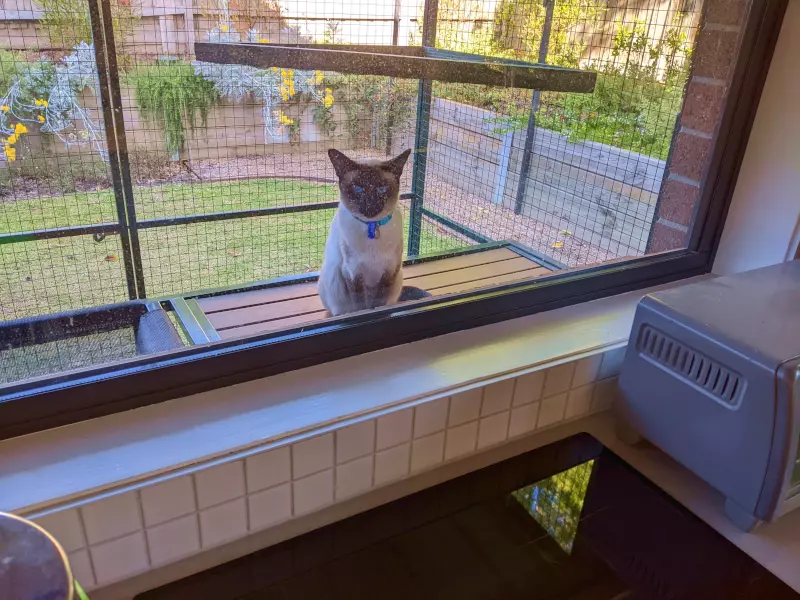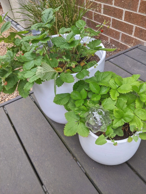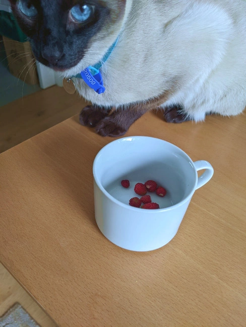 We brought the strawberries with us when we moved. They no longer serve the purpose of signalling, "Hey! This is a door!" Nevertheless, they are still fruiting. Desmond in one of the photos is there to provide scale. He is a small cat, and the berries are smaller still!