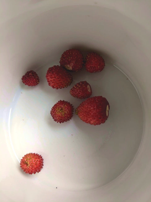 Our Hurstbridge house had a handsome front porch with lace brackets on the posts. The outside wall was a series of tall windows that looked across from our hill top to the beautiful forested hill top to our south. HOWEVER! When people climbed our driveway to get to the door (and climb they did), from their angle of entry it was hard to tell where the door was. To remedy this I bought some alpine strawberries, and put them on either side of the door for decoration and to provide a few fruits to sprinkle on my morning breakfast.