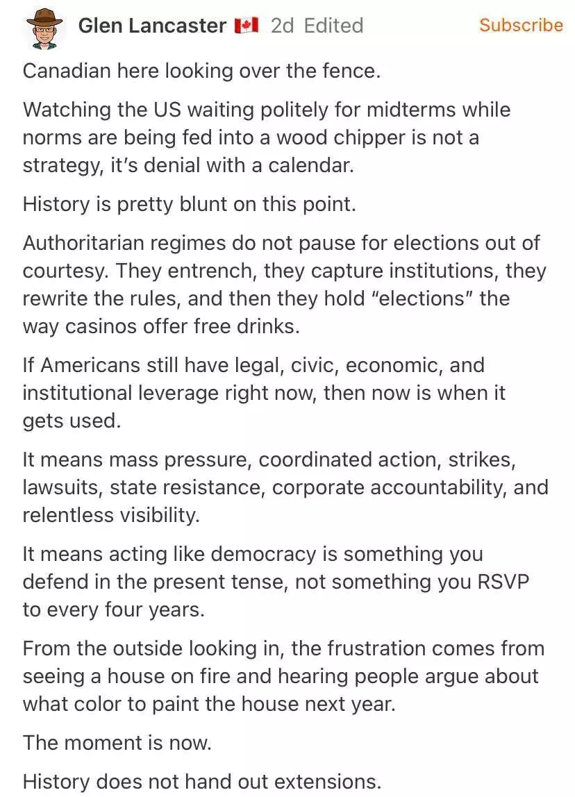 A comic from 2022. I want to make a distinction between the Democrats who are speaking out forcefully against authoritarianism and those whose overcautious approach enabled the extremist takeover of our institutions. This is about the dangers of unaccountability and kicking the can down the road. As recent elections demonstrate, voting is still extremely important.