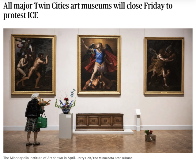 mastodon.social/@heidilifeldma… heidilifeldman@mastodon.social - The Minnesota walkout scheduled for tomorrow is growing. All major Minneapolis art museums will be closed. startribune.com/ice-raids-minn…