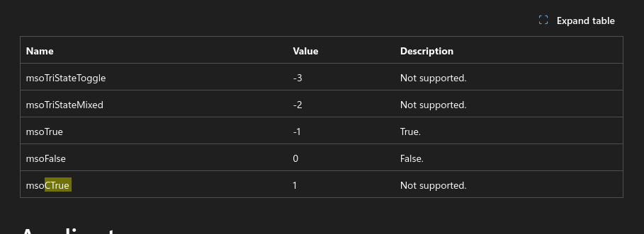 MsoTrioState is "a tri-state Boolean value". it has five possible values. only two of them are supported.