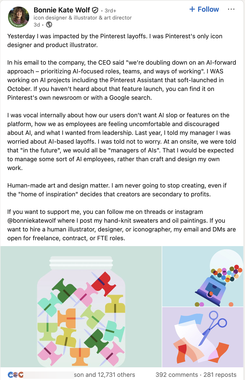 Pinterest laid off its only icon designer as part of their AI-focused layoffs.