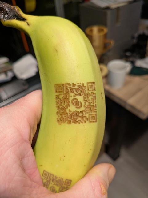 You where all thinking it. And the answer is 'yes!'. Yes you can totally LASER engrave a banana to exfiltrate data from your secured premises. Just out of the machine the text is barely noticable. But the next morning? Clear as day.
