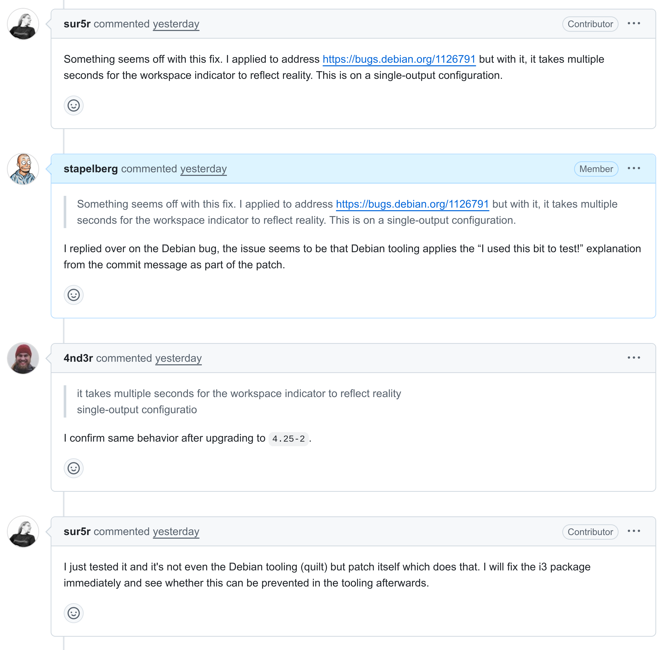 This is how a sleep(1) made it into i3 4.25-2 in Debian unstable.