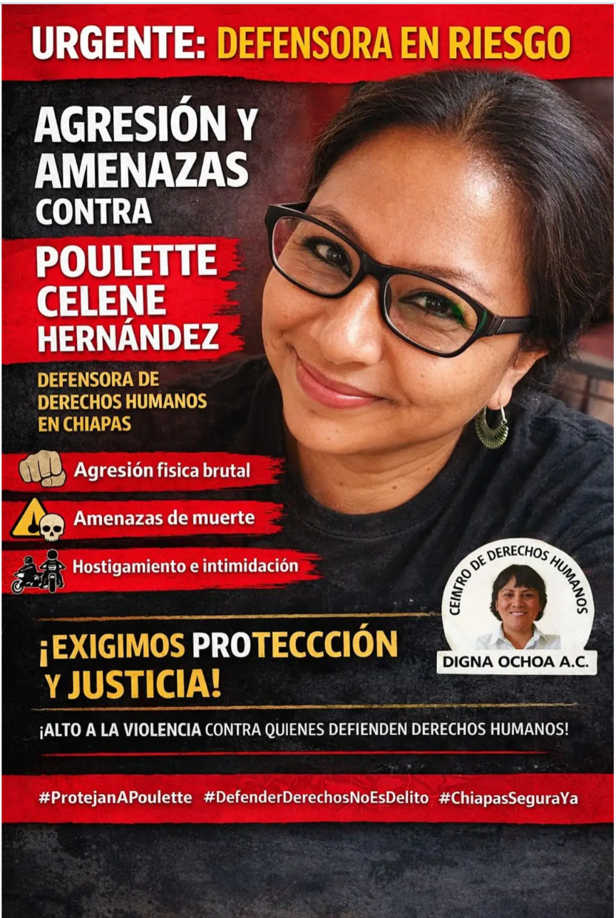 Fecha de emisión: 09 de febrero de 2026 Lugar: Tonalá, Chiapas, México Código: CDHDO-MEX-01-2026 Tipo de riesgo: Agresión física, amenazas de muerte, hostigamiento, riesgo inminente Persona en riesgo: Poulette Celene Hernández, Defensora de Derechos …CDH Fray Bartolomé de Las Casas