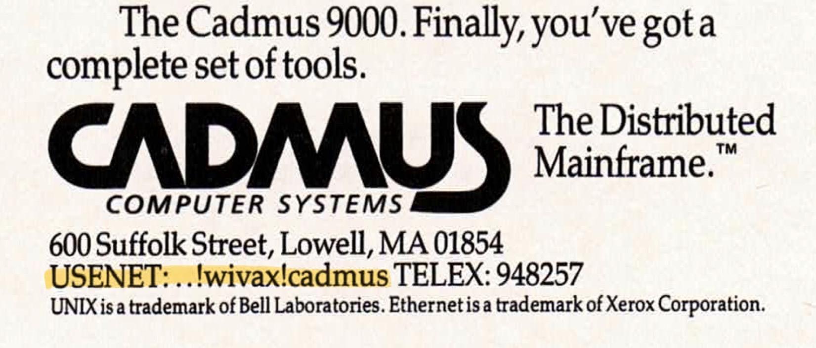 Please don’t be shocked, but I’ve been reading old #UNIX Review magazines on Archive.org, as one does. I’ve been finding a number of interesting artifacts throughout. This June 1984 ad by Cadmus Computer Systems listed a #USENET address: !wivax!cadmus.