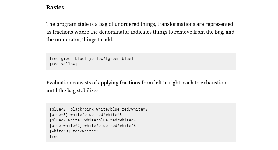 The program state is a bag of unordered things, transformations are represented as fractions where the denominator indicates things to remove from the bag, and the numerator, things to add. Evaluation consists of applying fractions from left to right, each to exhaustion, until the bag stabilizes.