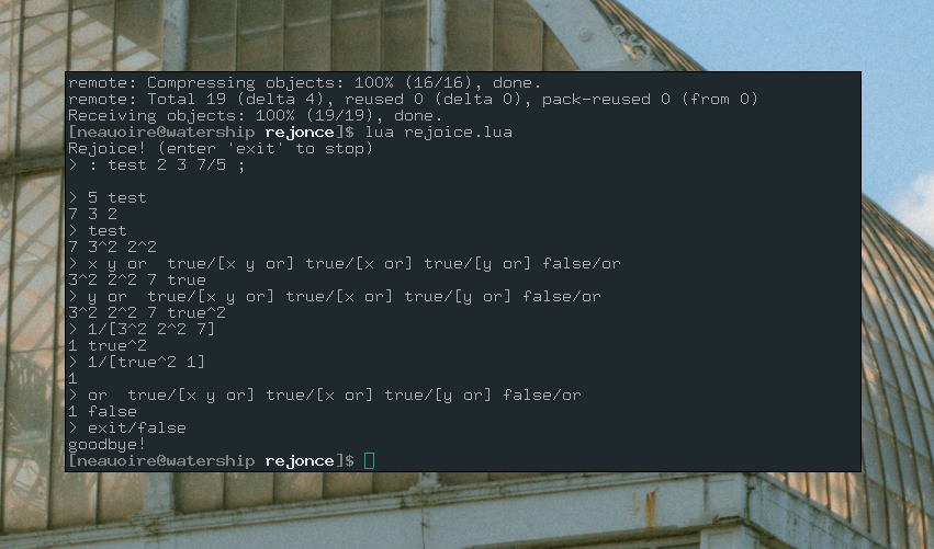 Wrote a little interpreter in lua for @neauoire 's rejoice programming language today to decompress after exams. Its nice to write something fun again 😀