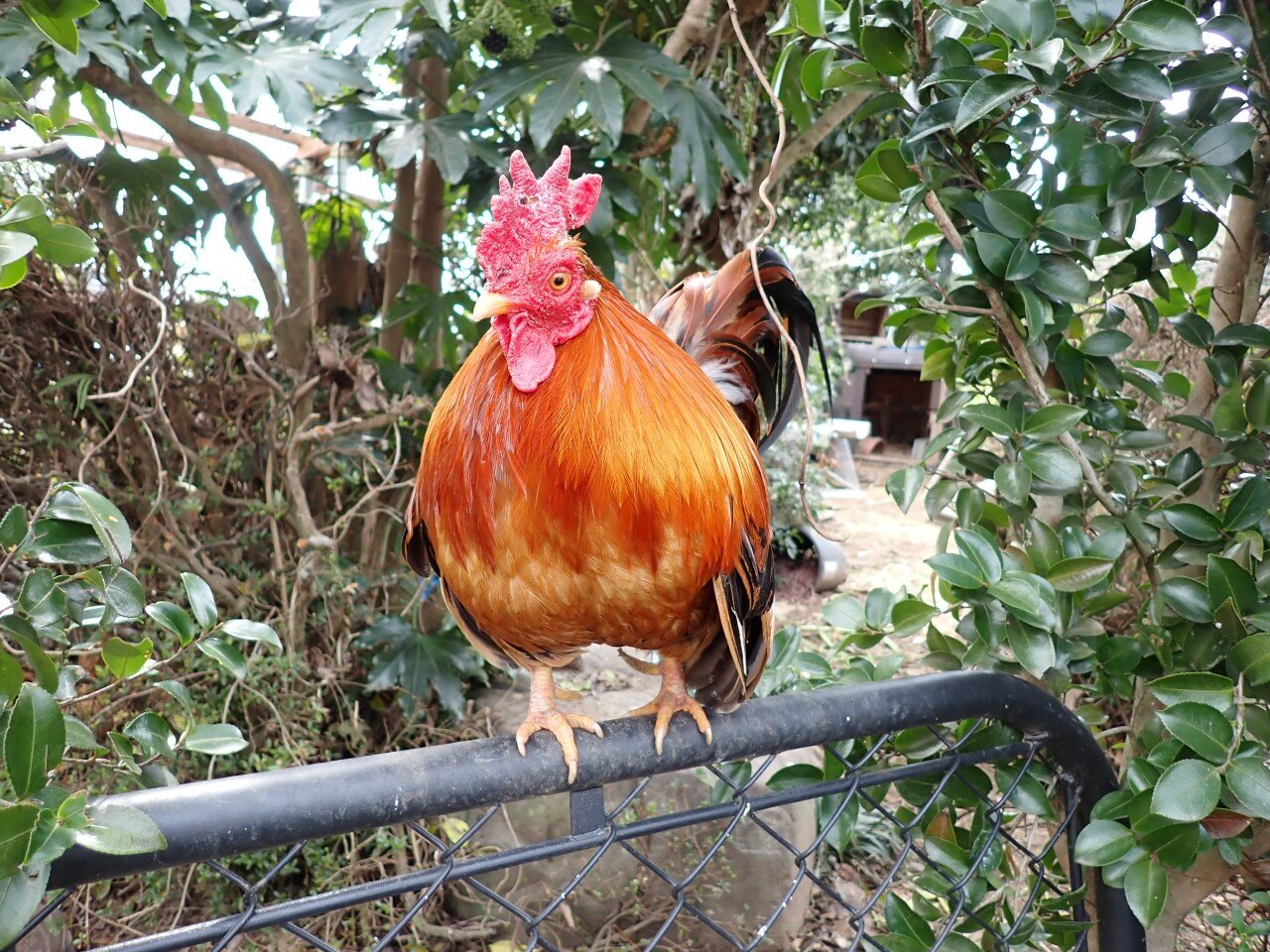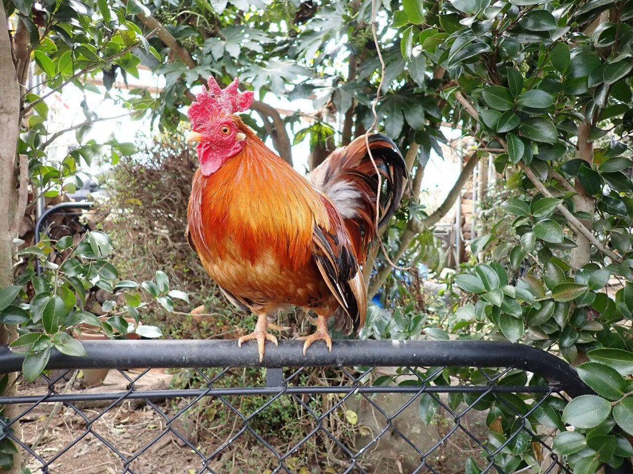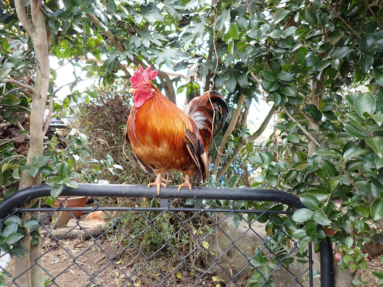 Chabo Houdini, on the fence watching out for everyone, I guess.. He looks cool there between the Sasanqua...