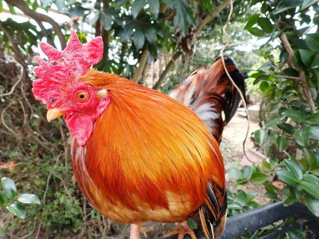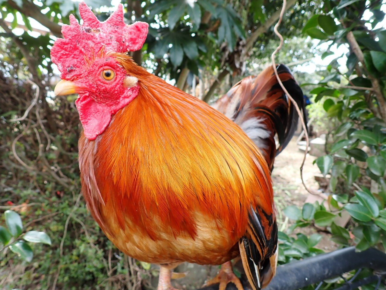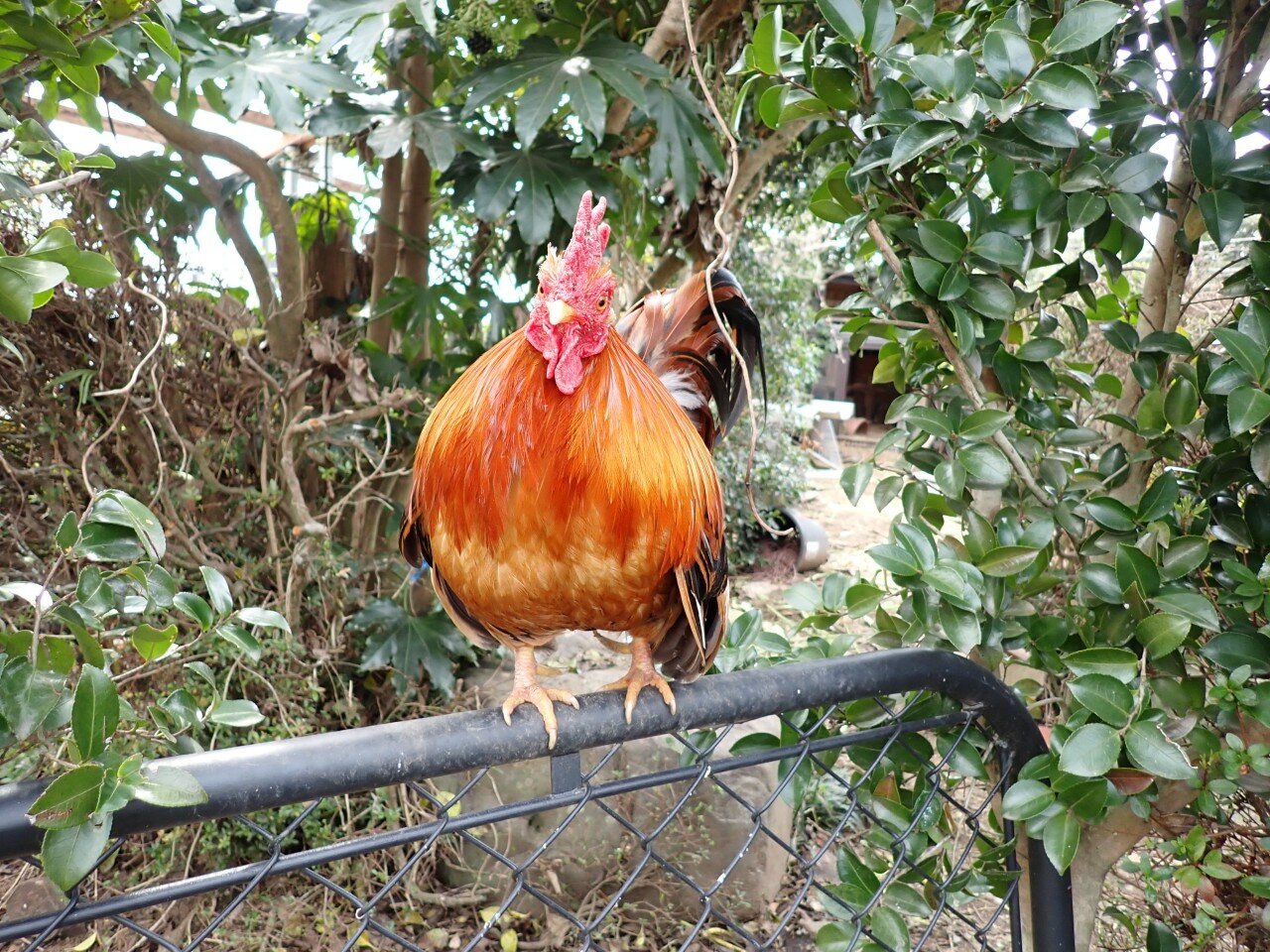 Chabo Houdini, on the fence watching out for everyone, I guess.. He looks cool there between the Sasanqua...